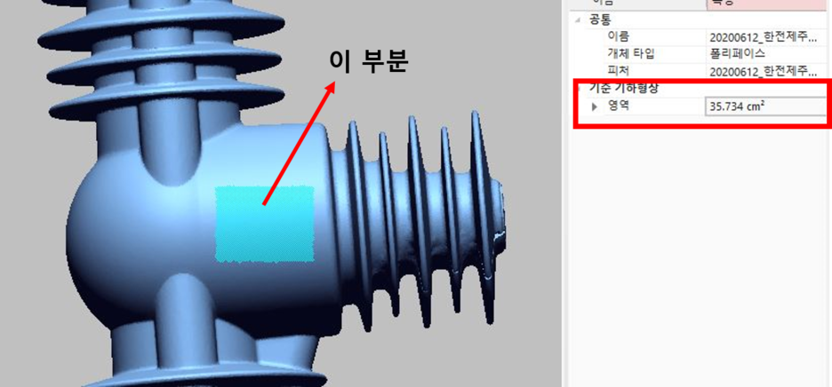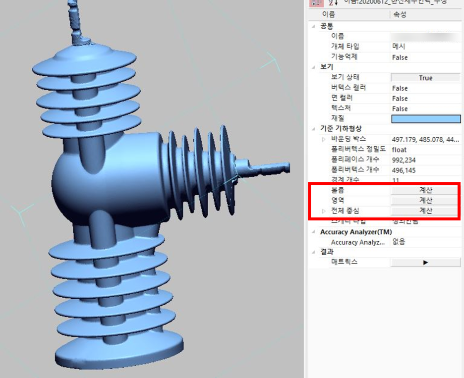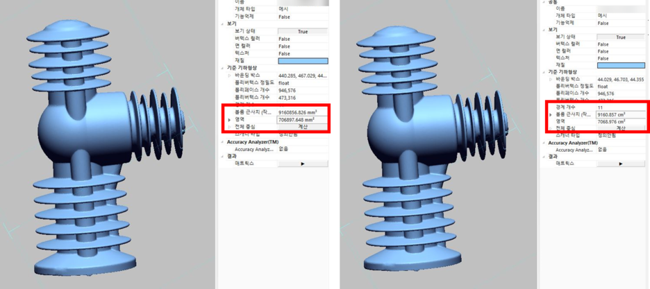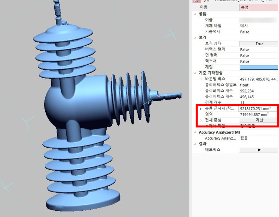 이렇게 표면적(영역)과 부피(볼륨)을 측정하는 기능이 있습니다.