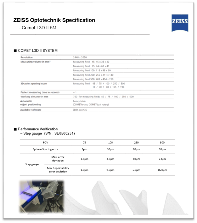 정밀 3D 스캐너는 독일 기술혁신지원기관인 VDE/VDI 인증을 거칩니다.