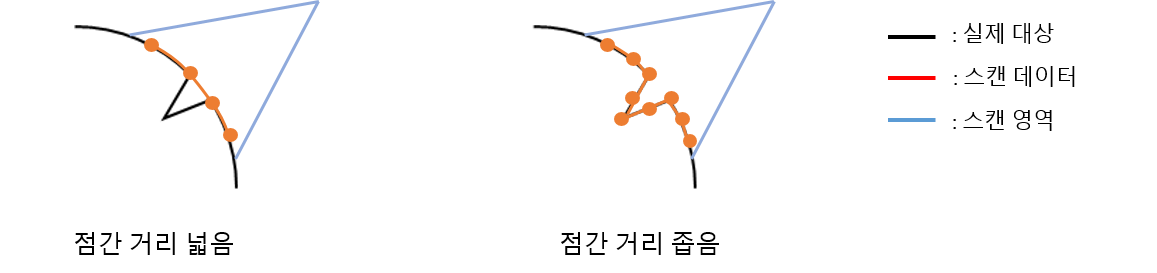 아래 사진과 같이 점간 거리가 좁을 수록 세밀한 스캔이 가능하게 됩니다.