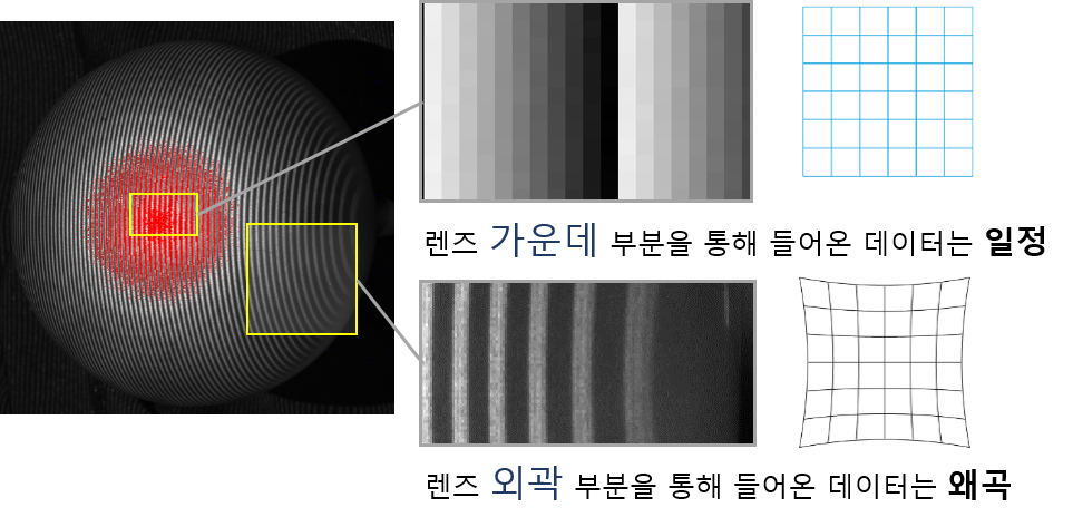 렌즈는 가장자리 부분이 휘어있기 때문에 데이터의 왜곡이 일어나게 됩니다.