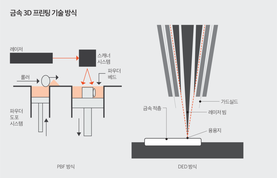 DED 방식은 고출력 레이저 빔을 금속 표면에